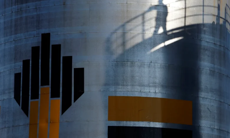 A worker’s shadow is cast beside the Rosneft logo at the Priobskoye oil field near Nefteyugansk, Russia, August 4, 2016. / Reuters